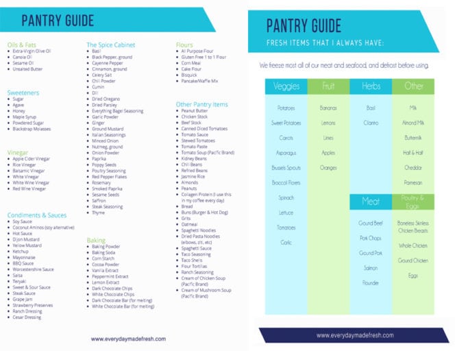 I have created a Pantry Guide for dry goods, as well as what we keep in our fridge and freezer.